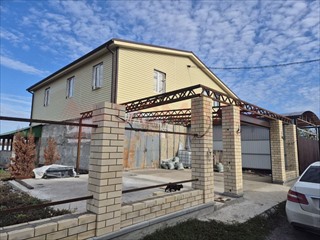 Лицевая часть забора выполнена из кирпича и установлен мощный каркас под навес. Автоматические ролл ворота премиум сегмента.